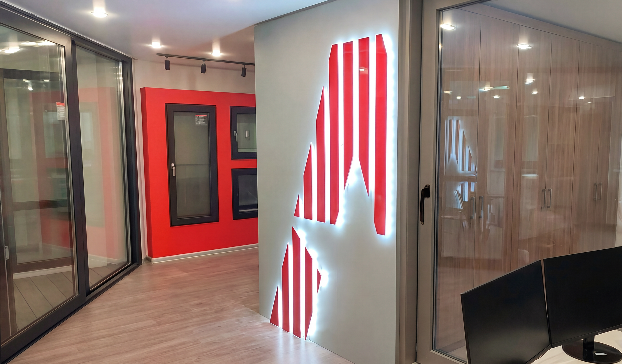 Простое и современное пространство для демонстрации решений. Здесь вы можете посмотреть образцы окон и дверей из ПВХ и алюминия, портальные конструкции, протестировать свойства шумоизоляционных и энергоэффективных стеклопакетов, а также получить консультацию и расчет от специалистов отдела продаж.